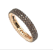 The three rows of chocolate-colored crystals are securely set in the band of the ring, creating a continuous band of sparkle and shine. The crystals are carefully selected for their high quality and brilliant shine, and are cut to maximize their light-reflecting properties, creating a dazzling effect.