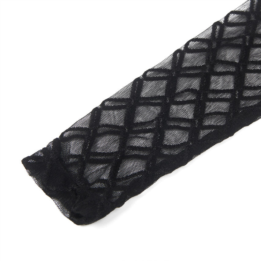 This black long sleeve bodysuit lingerie features a high cut neck, patterned mesh sleeves, and a cheeky back.