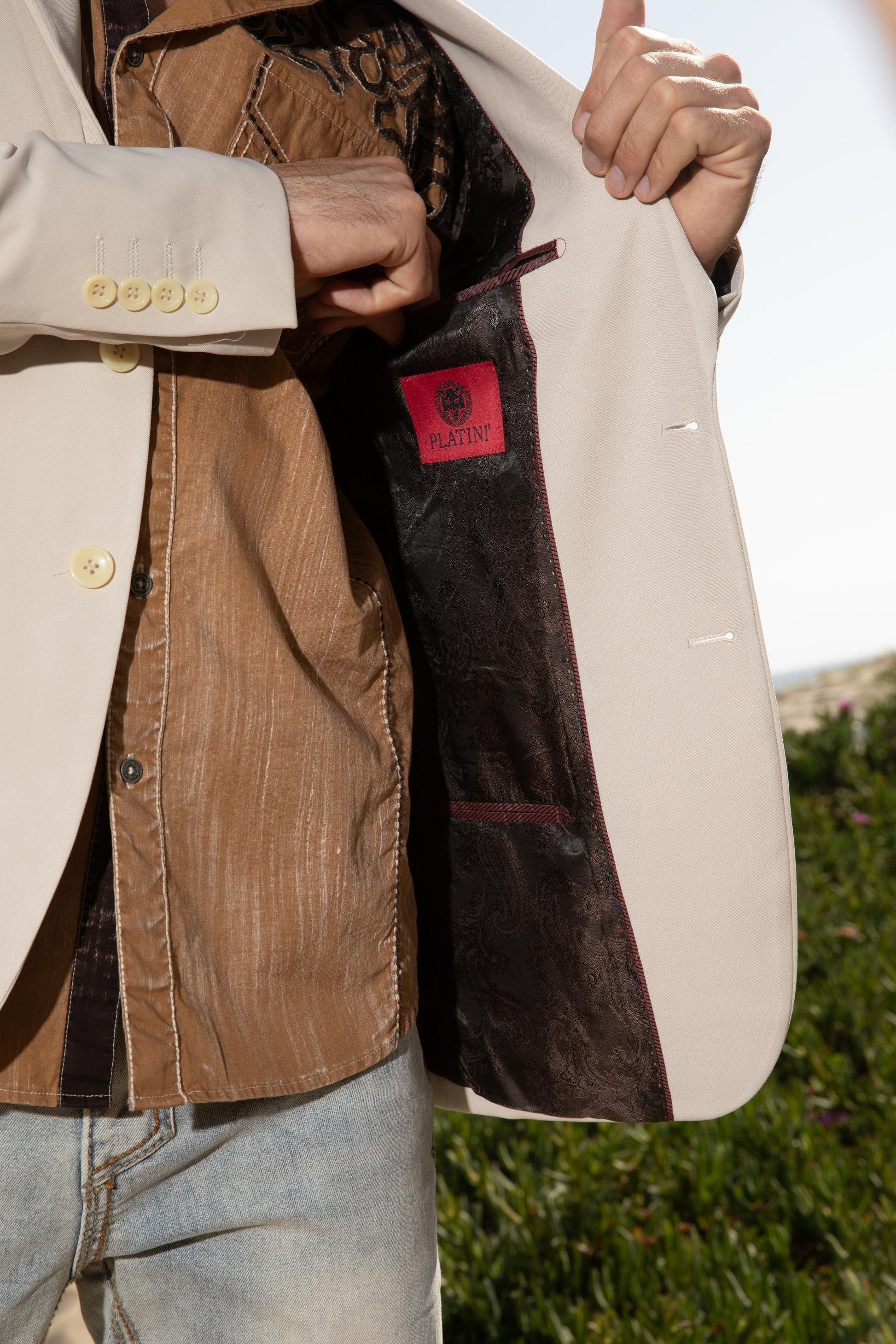 Description: Elevate your evening ensemble with our Men's Modern Fit Stretch Date Night Blazer, meticulously designed for sophistication and versatility. This refined blazer features two faux pockets at the hip and a chest pocket adorned with a contrasting fixed pocket square, adding a distinctive touch. The internal lining showcases the same design as the faux pocket square, adding a cohesive element to the ensemble. Additionally, it includes an internal pocket, perfect for storing small essentials or personal documents. With its two-button closure, four-button cuffs, and subtle lines for a tailored fit, this blazer exudes refined elegance and modern charm.