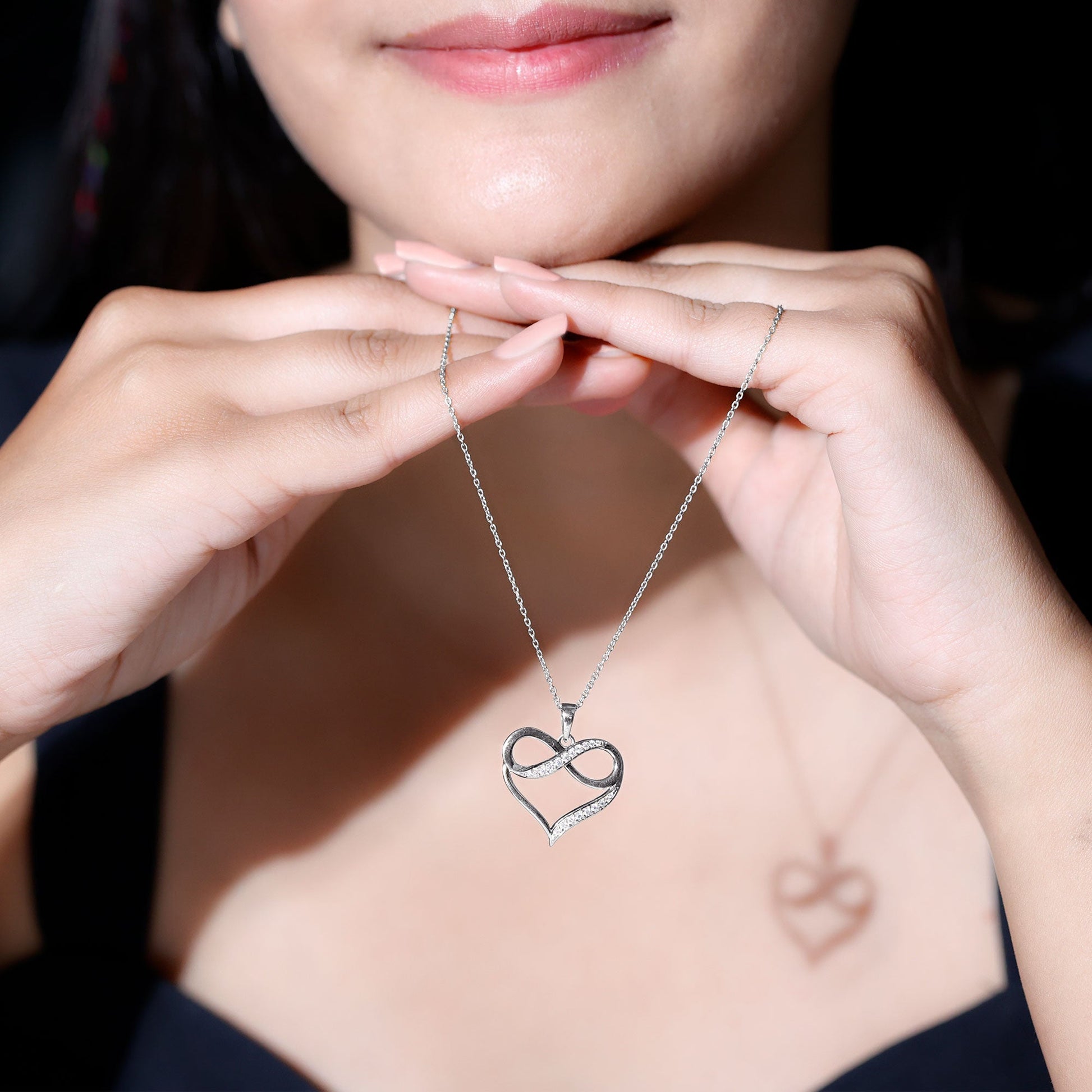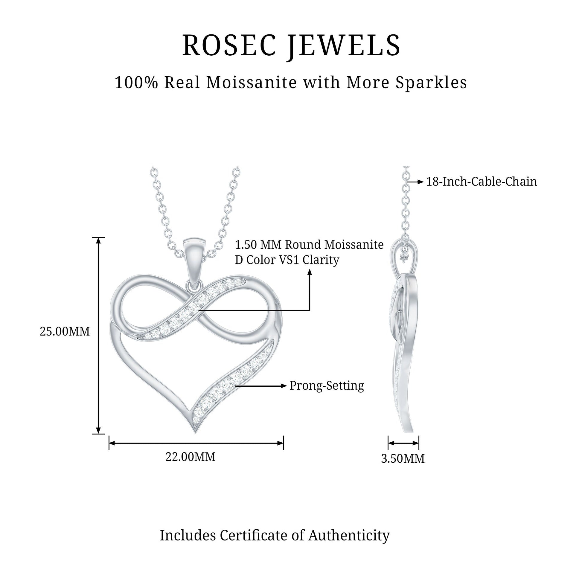 Elevate your style with this elegant Moissanite Pendant. Its sophisticated design and sparkly allure make it an ideal choice for dressing up any outfit. The pendant features petite colorless moissanite stones, beautifully crafted in an Infinity Heart design. Perfect for anniversaries, weddings, birthdays, and other special occasions, this pendant will be cherished for years to come, adding a sophisticated glow to your ensemble.