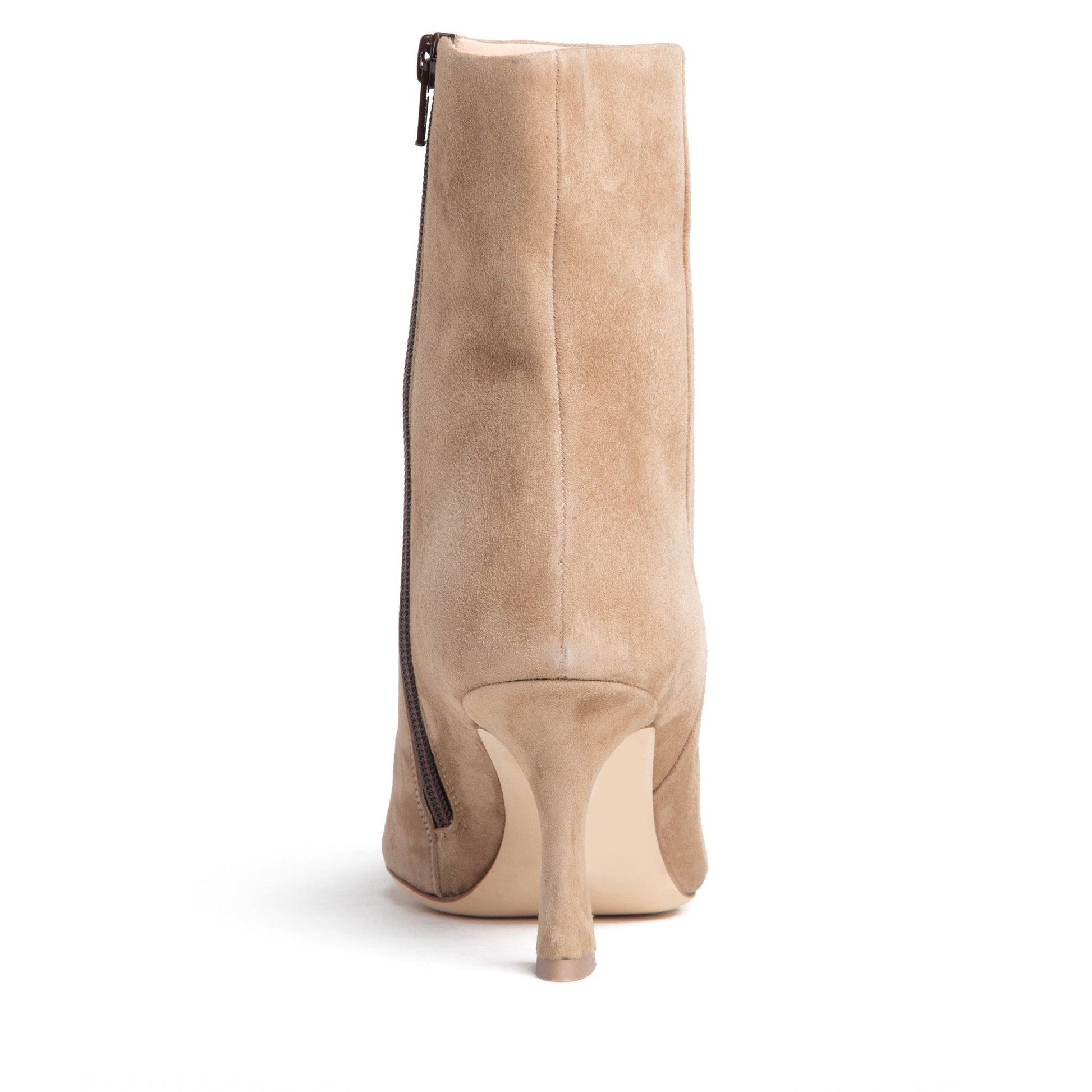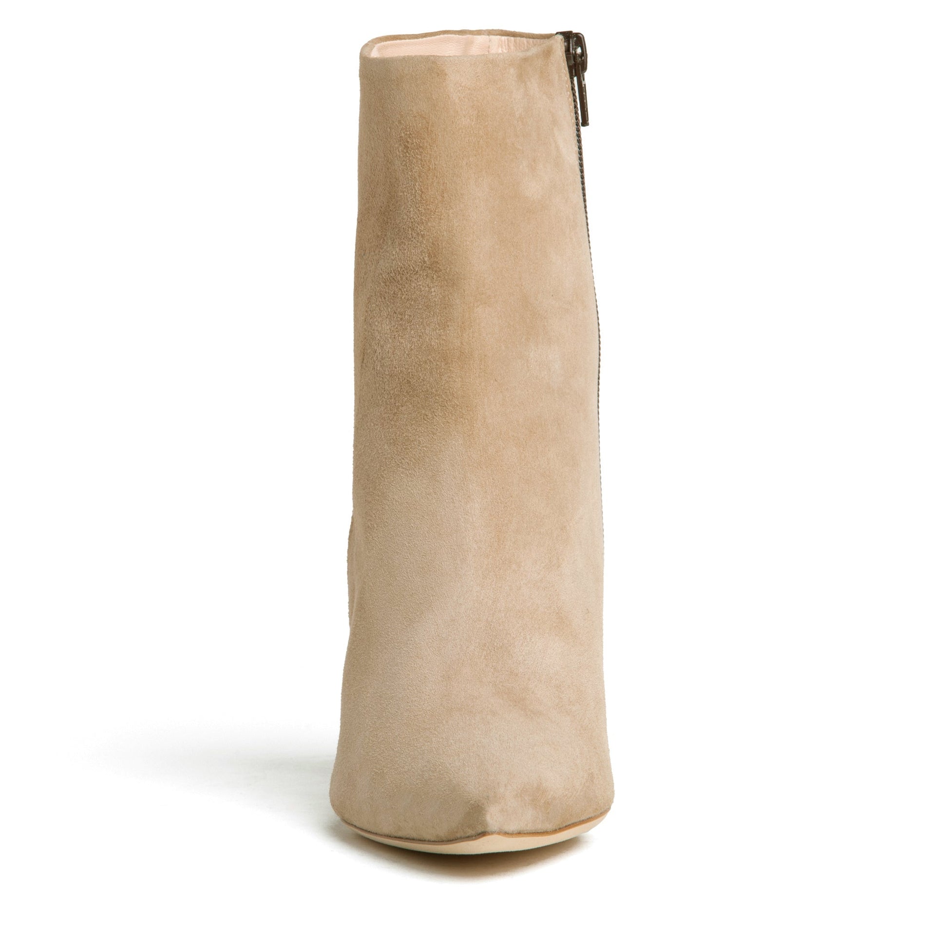 Modern ankle suede bootie with an inside zipper. This comfortable stylish pair features an edgy pointed toe and a medium height kitten heel, as well as a cushioned insole.