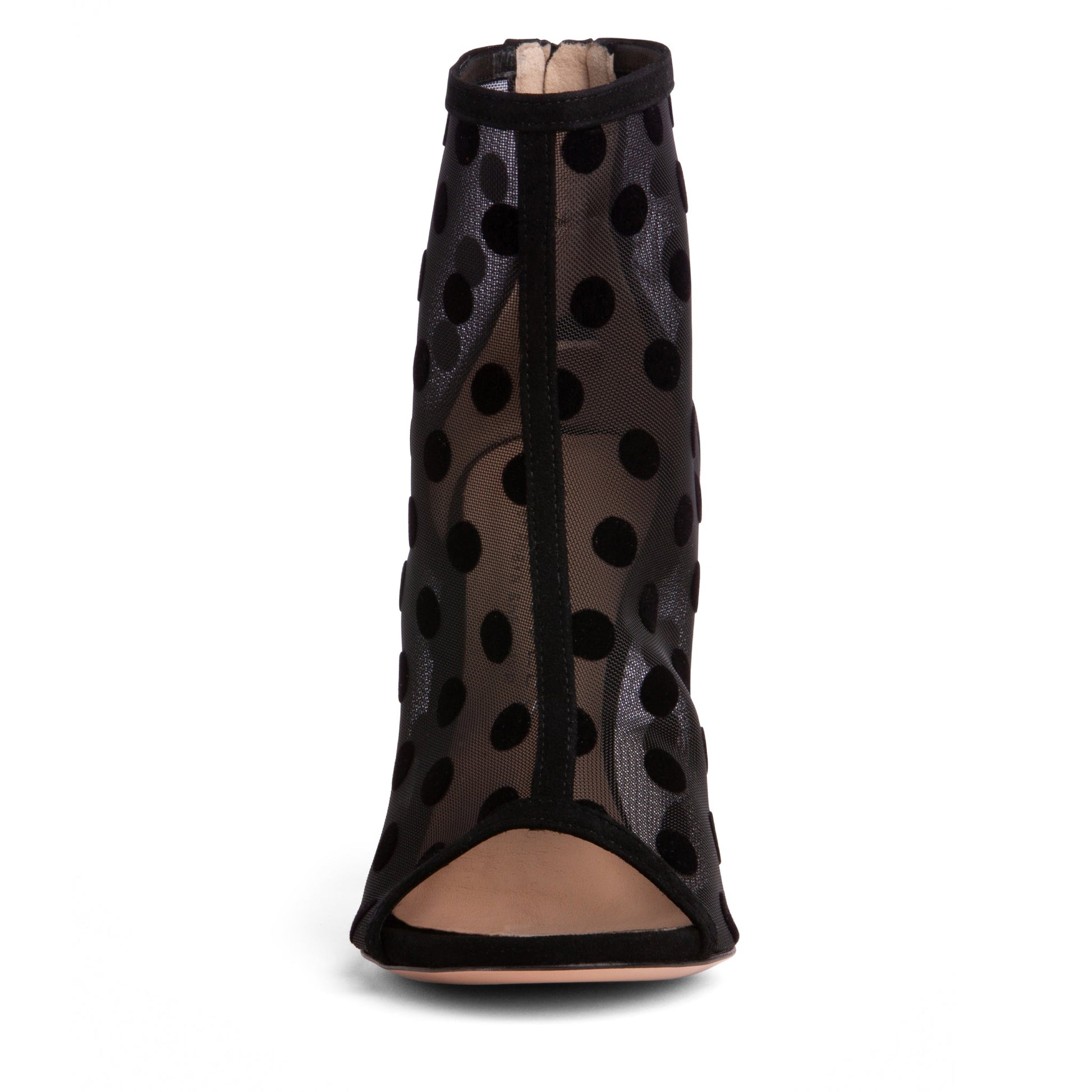 Coquette open round- toe ankle bootie with back zipper. The stunning stiletto pair is crafted in a blend of mesh, polka dots, and suede. This high-heel bootie features a cushioned insole for comfort and a non-marking leather outsole.