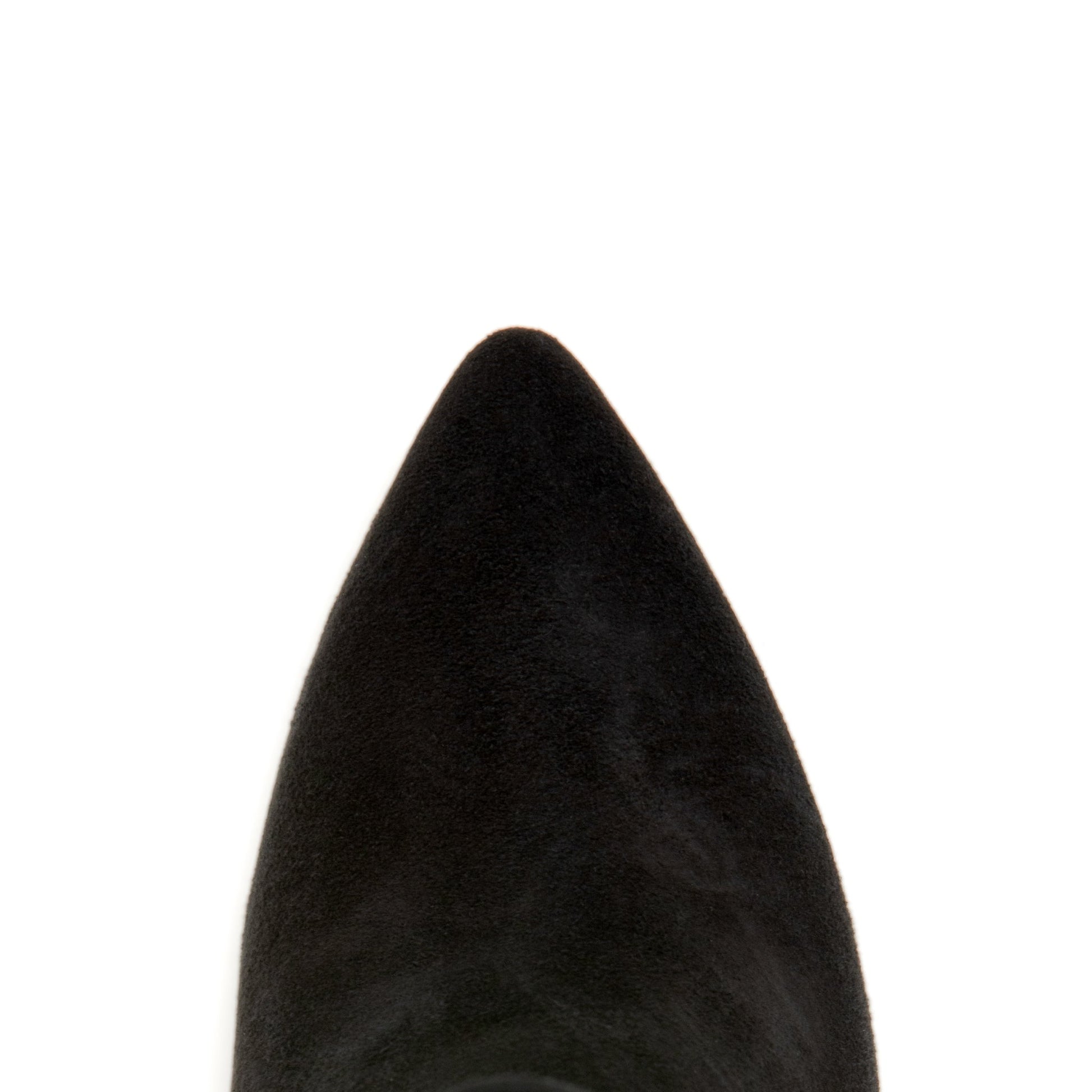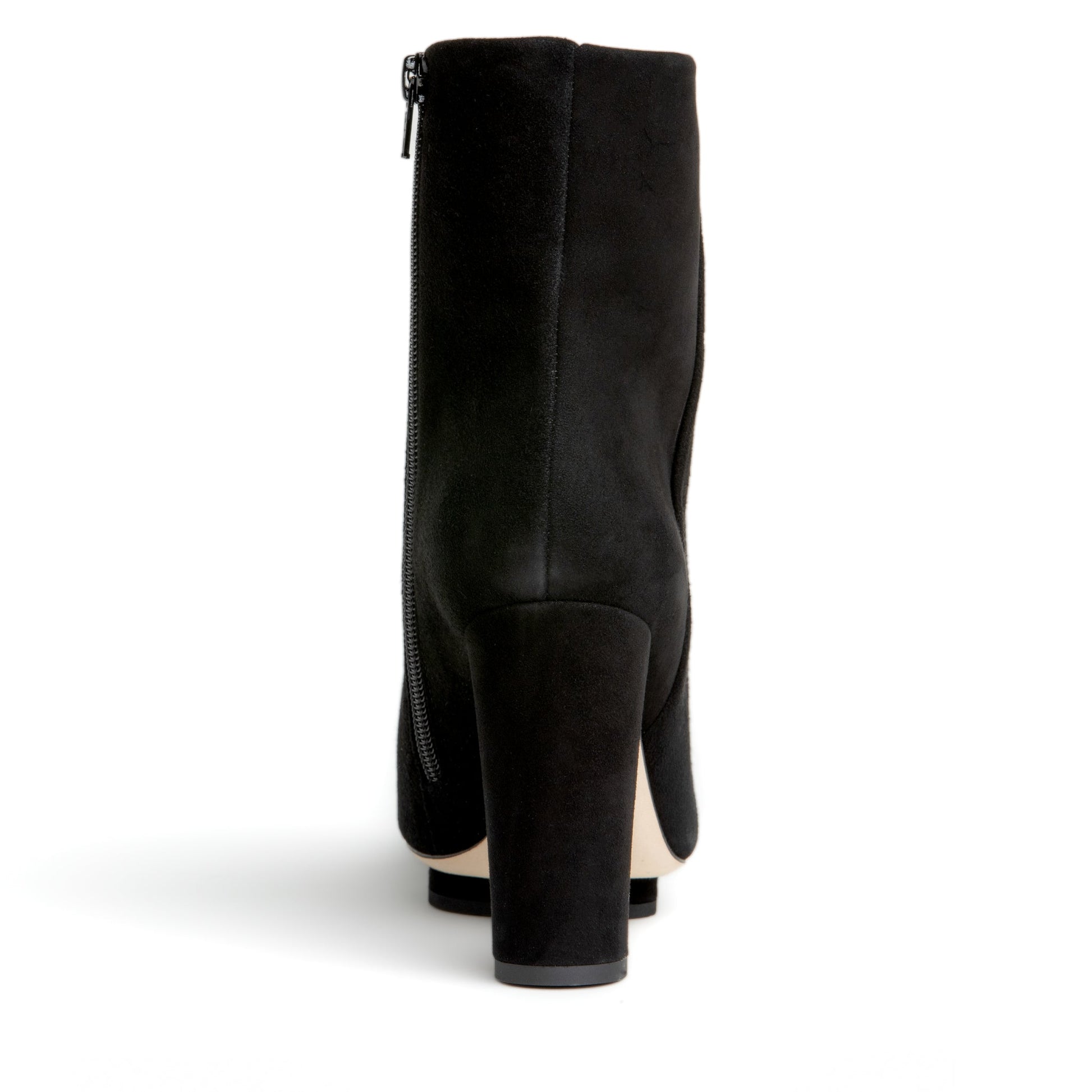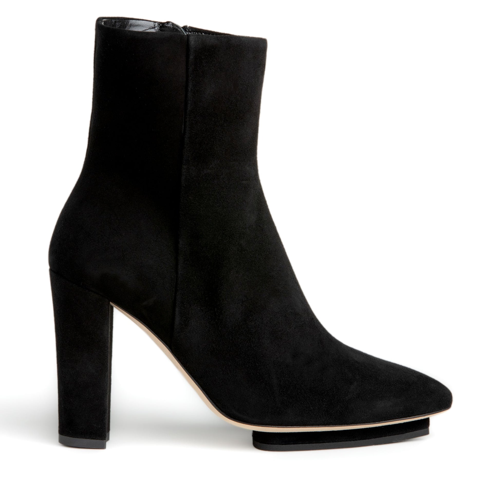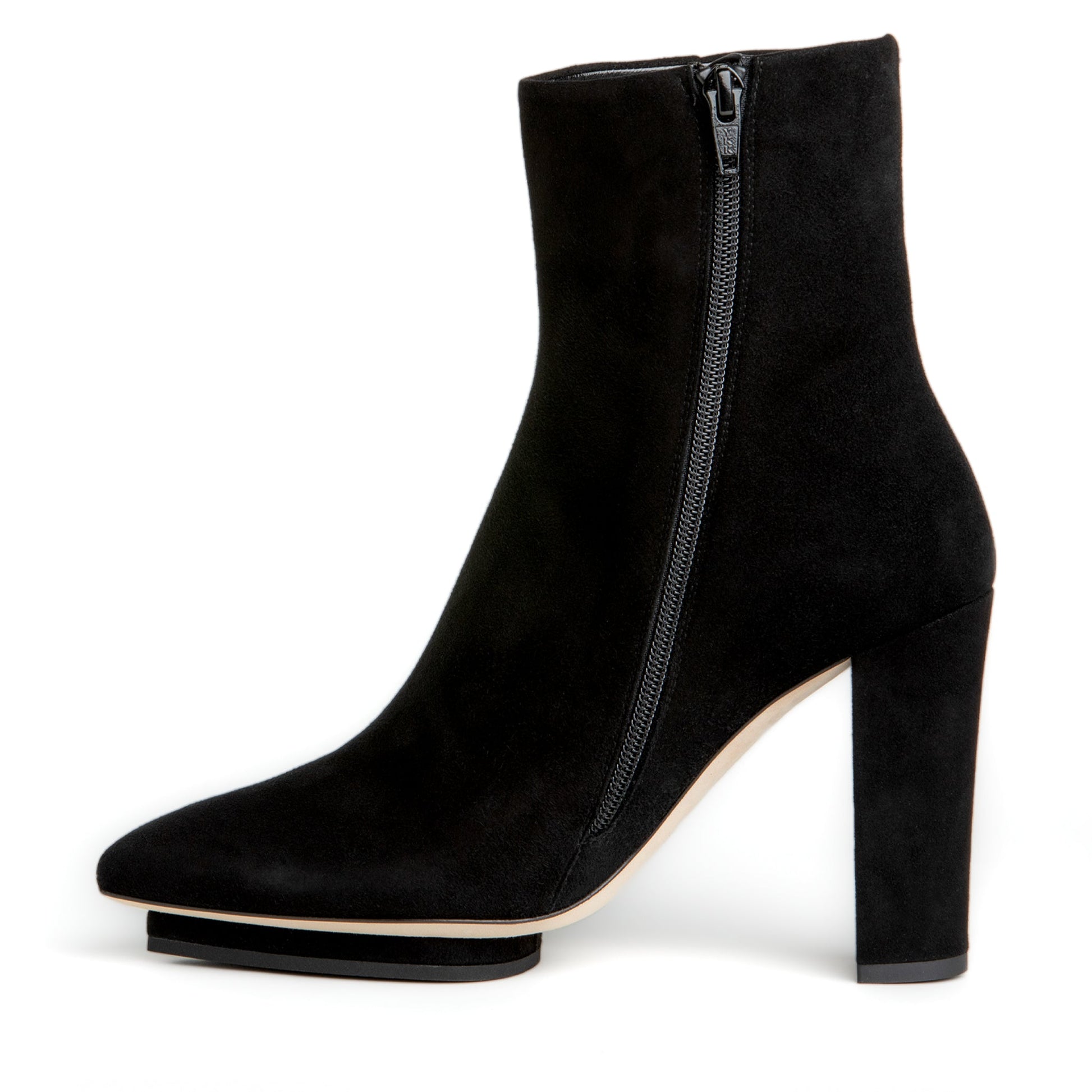 This ankle boot offers height with added comfort, but without the pitch, thanks to its hidden island platform and block heel. This bootie is crafted in black suede, cushioned insole and side zipper.