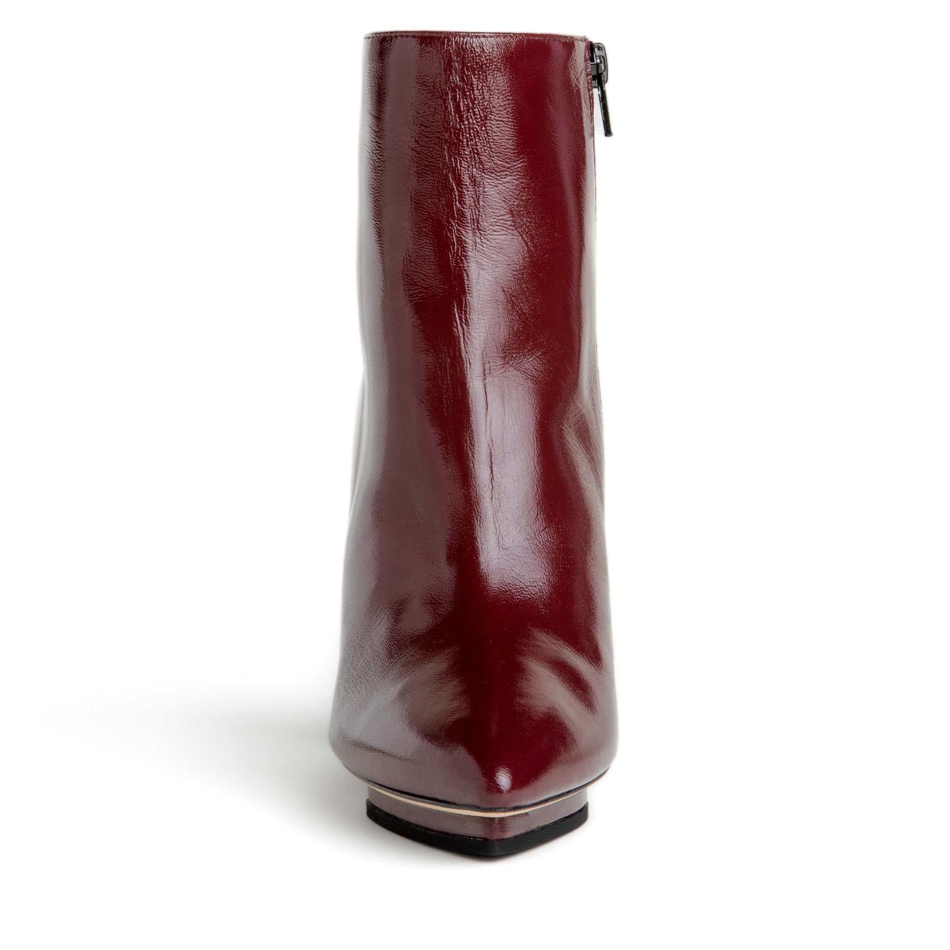 Striking ankle bootie crafted in crinkled black patent leather. This elegant day or evening style features a hidden island platform for an elevated look, which gives additional height without the uncomfortable pitch. The bootie has a cushioned insole for all-day comfort.